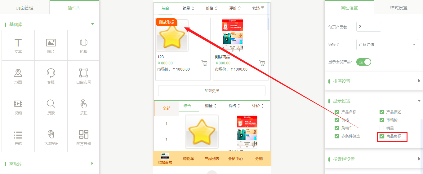2. 在建站中,拖出“产品列表”插件,在样式设置中开启角标,即可看到角标并设置样式。